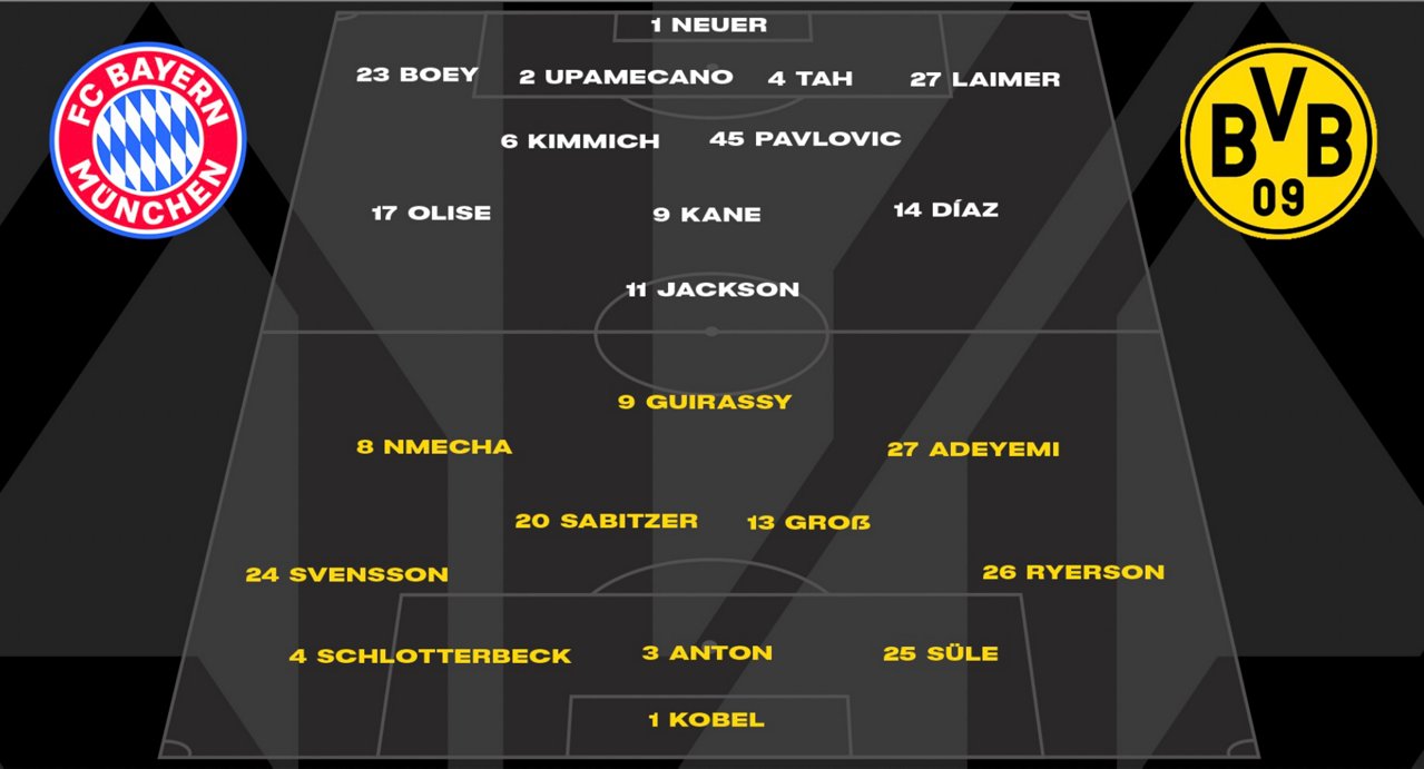 Центральной же встречей тура, без сомнения, была игра в Мюнхене, где в субботу вечером на стадионе «Альянц Арена» встретились между собой лидеры чемпионата местная «Бавария» и дортмундская «Боруссия». Венсан Компани выставил на игру сильнейший состав, не поменяв при этом и свою привычную расстановку 4-2-3-1: Мануэль Нойер, Дайот Упамекано, Джонатан Та, Конрад Лаймер, Саша Боэ, Йозуа Киммих, Александр Павлович, Луис Диас, Майкл Олисе, Николас Джексон и Гарри Кейн.