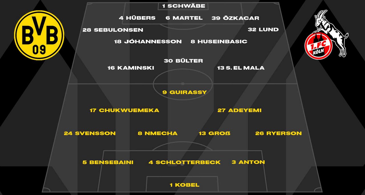 Главный тренер дортмундской «Боруссии» Нико Ковач использовал свою обычную схему 3-4-3, сделав при этом некоторые перестановки в стартовом составе: Грегор Кобель, Рами Бенсебаини, Нико Шлоттербек, Вальдемар Антон, Даниэль Свенссон, Феликс Нмеча, Паскаль Гросс, Юлиан Рюэрсон, Карни Чуквуэмека, Карим Адейеми и Серу Гирасси.
