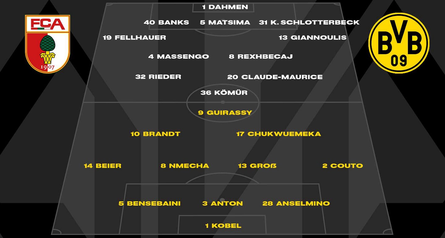 9-й игровой день в первой Бундеслиге стартовал в пятницу 31 октября матчем в городе Аугсбург, в котором местный одноименный клуб принимал дортмундскую «Боруссию». Главный тренер хозяев Сандро Вагнер выставил на матч следующий состав: Финн Дамен, Ноакай Бэнкс, Алексис Клод-Морис, Робин Фелльхауэр, Димитриос Яннулис, Мерт Кемюр, Хан-Ноа Массенго, Крислен Матсима, Эльвис Реджбечай, Фабиан Ридер и Кевин Шлоттербек.