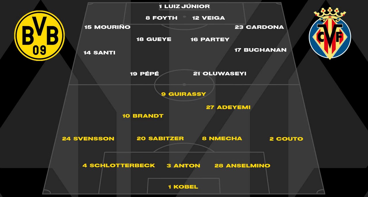 5-й игровой день группового раунда Лиги Чемпионов сезона 2025-2026 годов стартовал во вторник 25 ноября 2025 года девятью матчами, в числе которых был и поединок дортмундской «Боруссии» с «Вильярреалом» из испанского города Вильярреаль, который состоялся в Дортмунде на стадионе «Сигнал Идуна Парк». Главный тренер гостей Гарсия Тораль Марселино выпустил на поле следующий состав: Луис Жуниор, Серхи Кардона, Ренату Вейга, Хуан Фойт, Сантьяго Моуриньо, Тейджон Бьюкенен, Томас Партей, Пап Гей, Санти Комесанья, Тани Олувасейи и Николя Пепе.